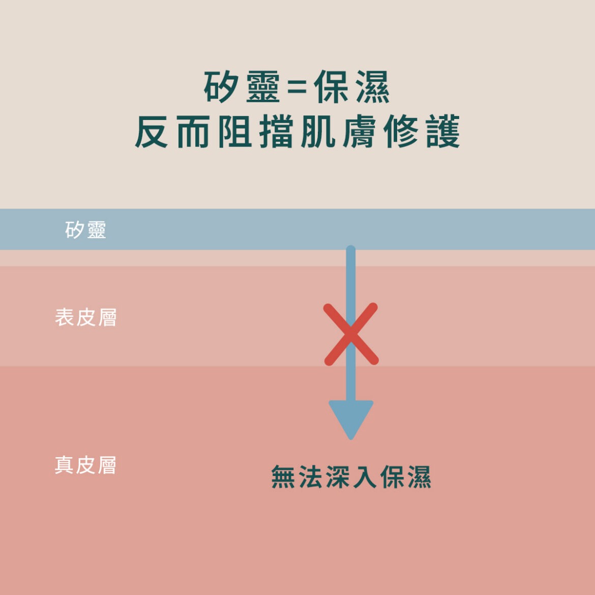 矽靈並不具備深入調理肌膚的功能,無法真正改善肌膚狀態,長期使用含矽靈產品,可能被柔潤的膚感所蒙騙,錯過保養修護的黃金時期。