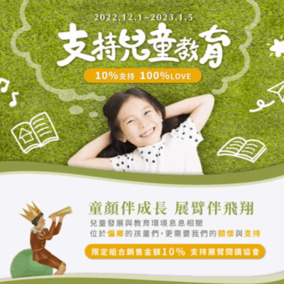 為了支持【台灣展臂閱讀協會】的偏鄉共讀推廣計畫,我們將 2022 年的 12 月訂為「展臂月」,並推出 7 組限定保養與洗沐組合,透過「10% 支持 100% Love」的方式為兒童教育盡一份心力,感謝童學們的熱情響應,幫助更多偏鄉家庭與孩童,讓孩子們有機會創造更美好的未來。