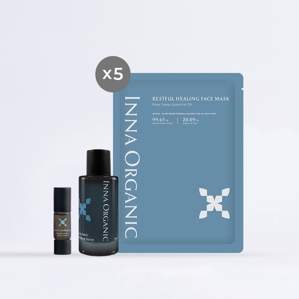 內含:藍艾菊睡月靜好舒眠噴霧 50 ml、藍艾菊舒眠修護精油面膜 5 片、 NO. 5 澄語精油滾珠瓶 5 ml
