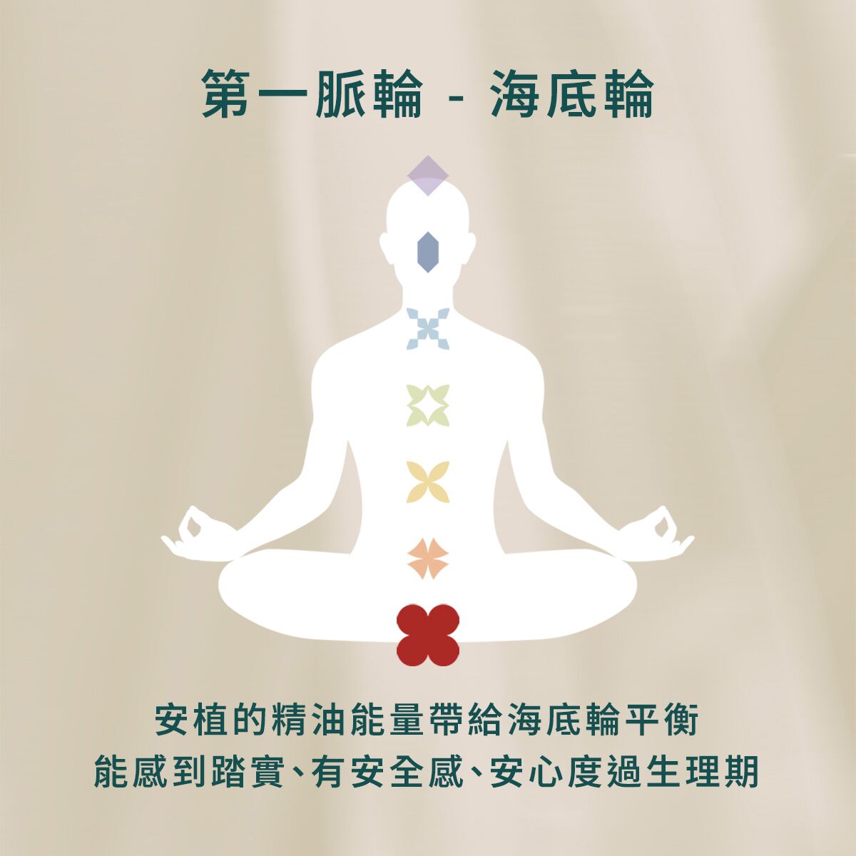 玫瑰天竺葵精油對應海底輪,其象徵內在穩定、安全感與生存基礎,關聯我們對自我與世界的信任感。當海底輪得以平衡和啟動,將帶來安全感,使我們回歸當下,感受到內在穩定與踏實。