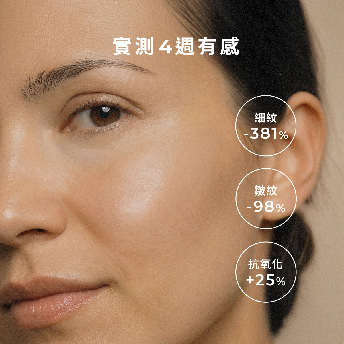 ✔ 實測四周有感,臉部細紋減少 381.3%,皺紋面積消除 98.1%,持續使用 56 天後,肌膚平滑緊實提升 11 倍