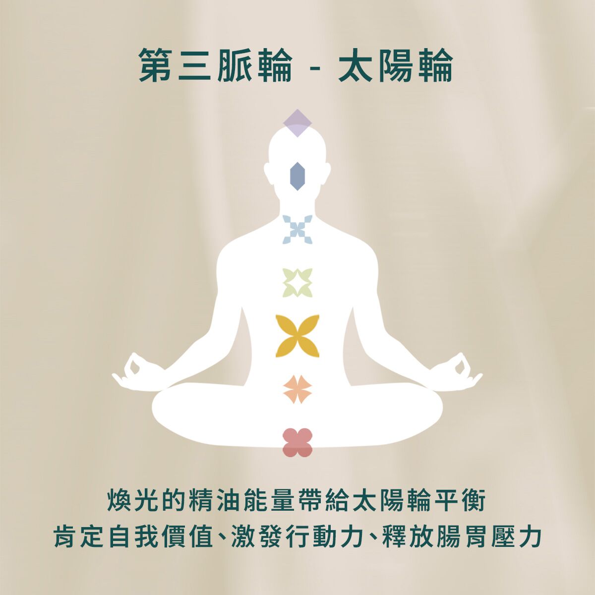 檸檬茶樹精油對應太陽輪,有助於促進內在力量、個人轉變與重生。太陽輪代表自信、意志力與個人成長,與我們的行動力、決策力和自我肯定密切相關。